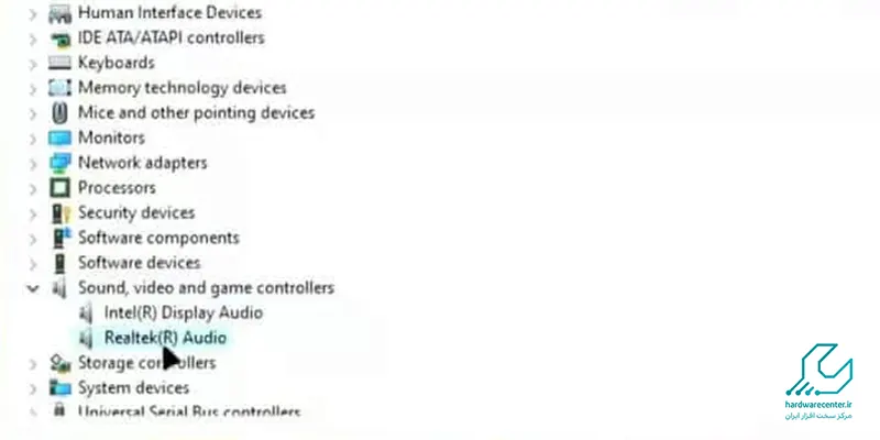 اکنون در فهرست پیش روی خود گزینه «مدیر دستگاه» را برگزینید، سپس بخش «کنترل های صدا، ویدئو و بازی» را گسترش دهید.